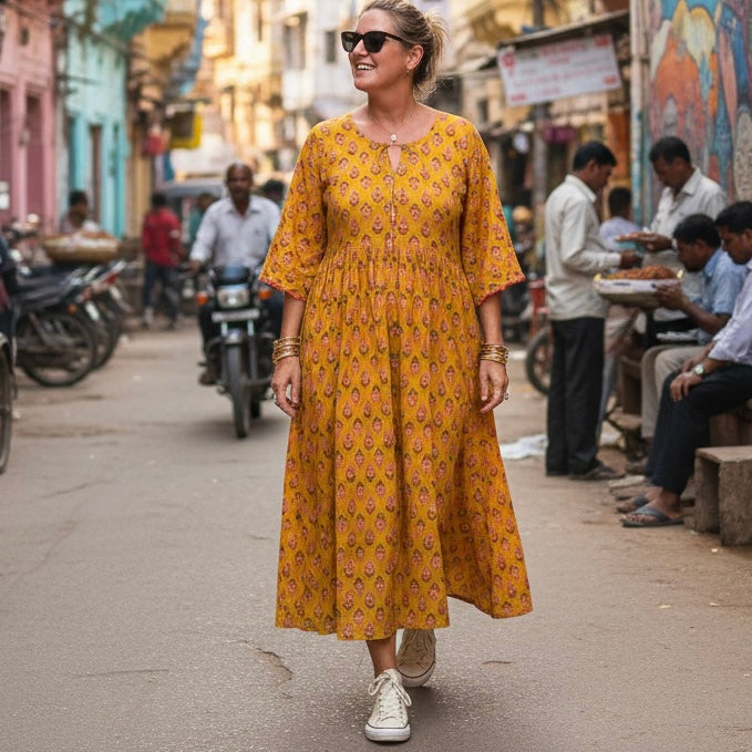 The Keya Dress is a stunning fusion of Jaipur block prints and Mughal-inspired design. Featuring beautifully embroidered cuffs, this dress is your new statement piece.