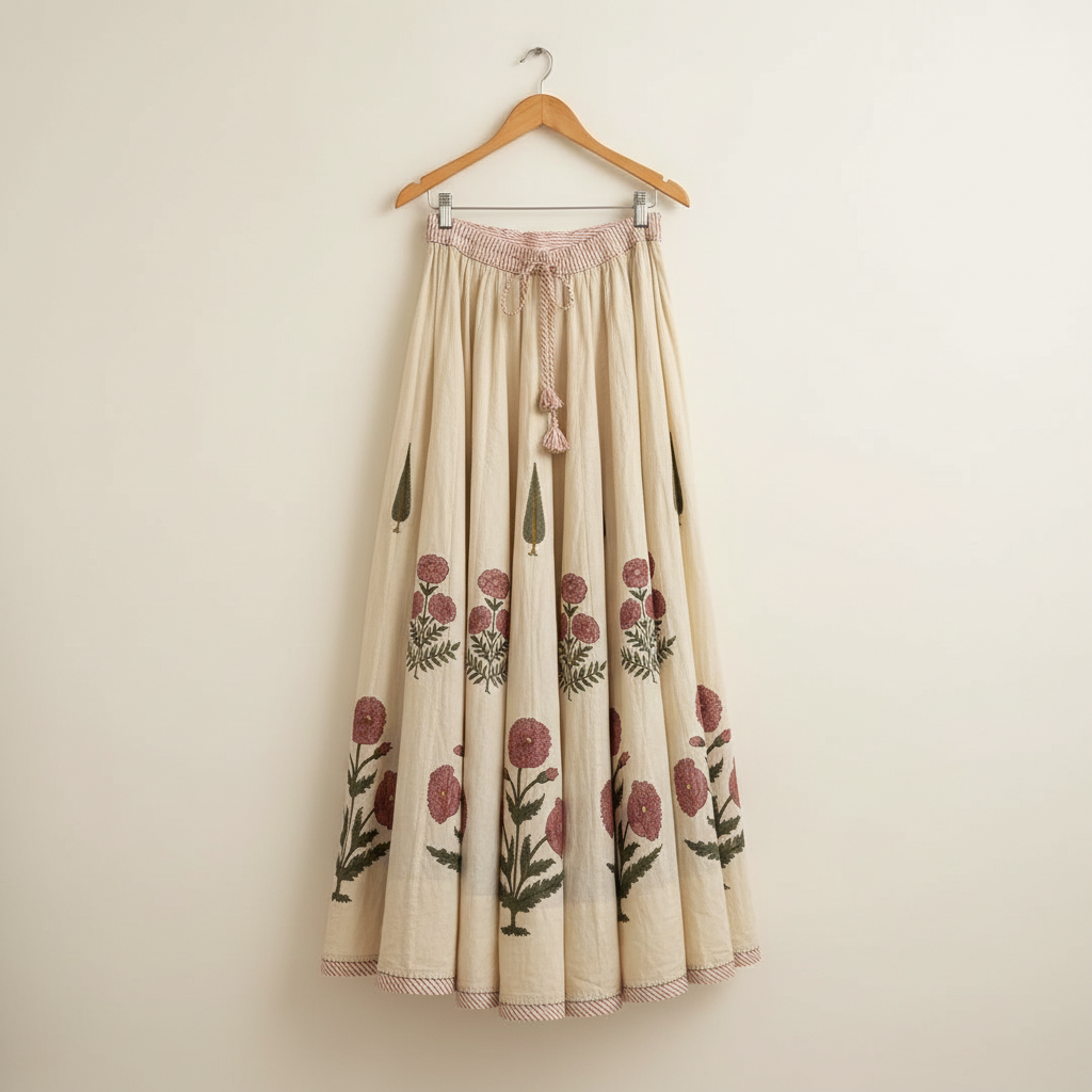 A flowing, elasticated waist skirt that blends timeless Mughal elegance with modern bohemian style. Featuring a customizable fit and pockets for added convenience.